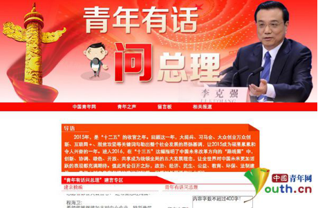圖為團中央青年之聲平臺2016全國兩會“青年有話問總理”頁面。