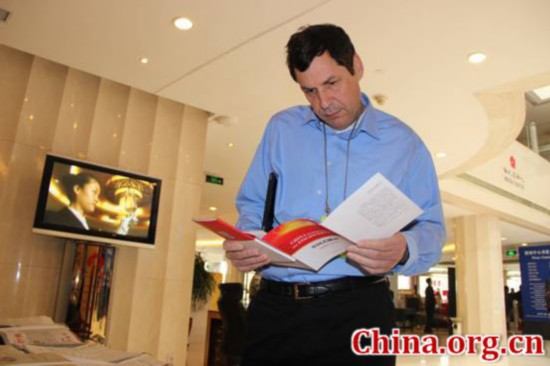 美國彭博新聞社記者馬克·邁爾尼克認(rèn)真翻閱《中國關(guān)鍵詞》。[中國網(wǎng) 吳瓊靜 攝]