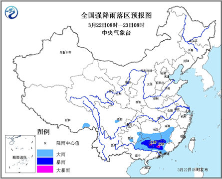 中國天氣網(wǎng)訊 中央氣象臺(tái)3月22日06時(shí)繼續(xù)發(fā)布暴雨藍(lán)色預(yù)警:
