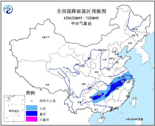 預(yù)計(jì),6日08時(shí)至7日08時(shí),湖北東部、安徽中南部、江蘇中南部、上海、浙江北部、江西北部、湖南中部和東北部、貴州東南部、廣西北部等地有大雨,其中,安徽南部、湖北東南部、江西北部、湖南中部和東北部、貴州東南部等地的部分地區(qū)有暴雨,局地大暴雨(100~120毫米);上述部分地區(qū)有短時(shí)強(qiáng)降水,最大小時(shí)雨強(qiáng)20~40毫米,局地伴有雷暴大風(fēng)或冰雹。中央氣象臺(tái)4月6日06時(shí)繼續(xù)發(fā)布暴雨藍(lán)色預(yù)警。
