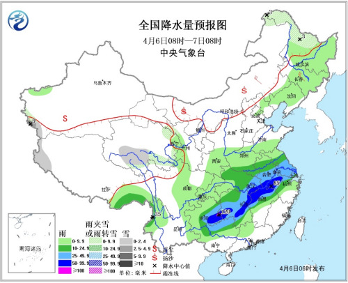 5日8時(shí)至6日6時(shí),甘肅中部、青海東部、西藏中部等地部分地區(qū)降雪、雨或雨夾雪2~7毫米;浙江西北部、安徽中部和南部、河南東南部、湖北中北部和南部、重慶東南部、湖南西北部、貴州東北部等地降大雨,安徽南部、湖北南部、湖南西北部等地部分地區(qū)降暴雨,湖北武漢、仙桃等局地降大暴雨(100~133毫米)。