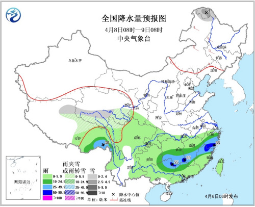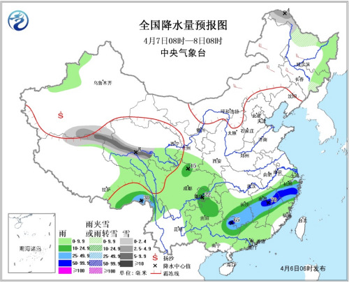 中央氣象臺(tái)發(fā)布暴雨藍(lán)色預(yù)警 局地有大暴雨或冰雹,4月4日20時(shí)至5日20時(shí),黑龍江東北部、青海南部、西藏東部等地有雨夾雪;伊犁河谷、西北地區(qū)東部、西藏東南部、云南西部和南部、西南地區(qū)東部、黃淮西部、江淮中西部、江漢、江南西部和南部、華南大部等地有小到中雨,局地有大雨。