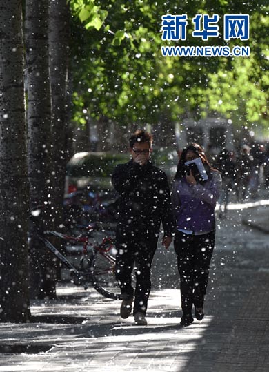 4月8日,路過北京朝陽區(qū)水碓子中街的行人紛紛掩鼻躲避漫天飛絮。