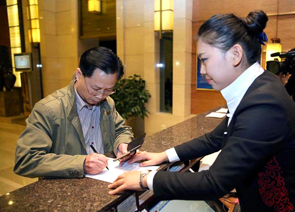 【全國(guó)首張】4月30日24時(shí)許,陳生(左)在北京民族飯店填寫增值稅發(fā)票客戶信息表。5月1日,營(yíng)業(yè)稅改征增值稅改革在全國(guó)推開。當(dāng)天零點(diǎn)一過,正在北京民族飯店結(jié)賬的溫州商人陳生接過了飯店開出的第一張?jiān)鲋刀悓S冒l(fā)票,令他驚喜的是這張發(fā)票也是營(yíng)改增試點(diǎn)全面推開后全國(guó)首張?jiān)鲋刀惏l(fā)票。