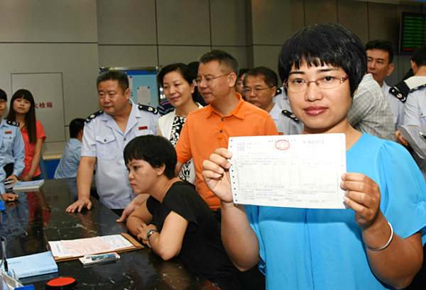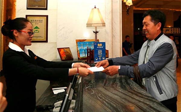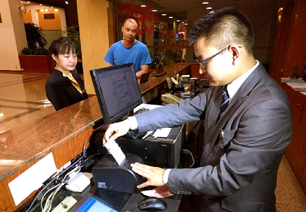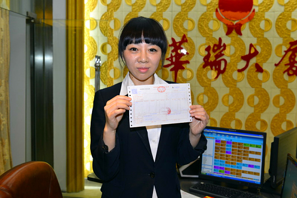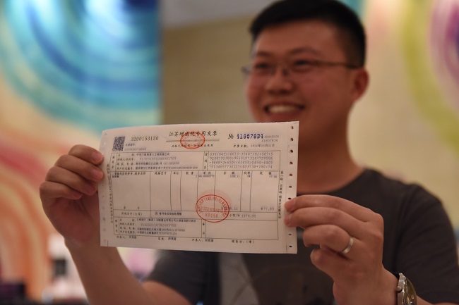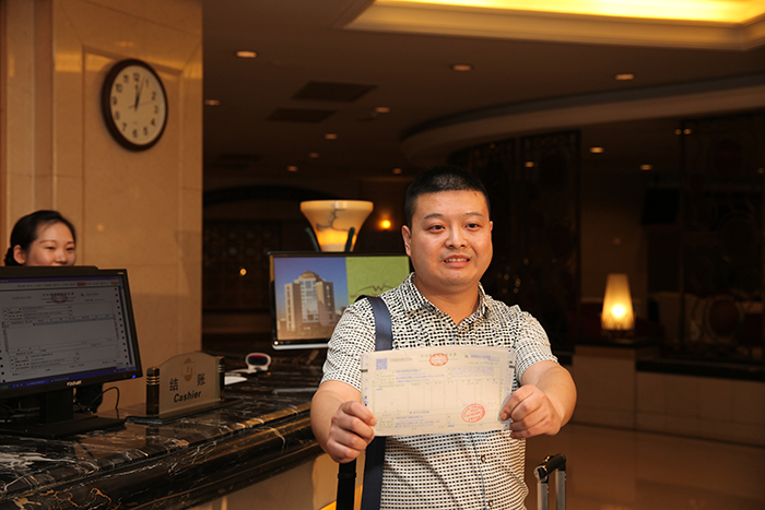 【福建】5月1日,住客謝平在展示由福州大飯店開出的營(yíng)改增試點(diǎn)全面推開后福建省首張?jiān)鲋刀惏l(fā)票。