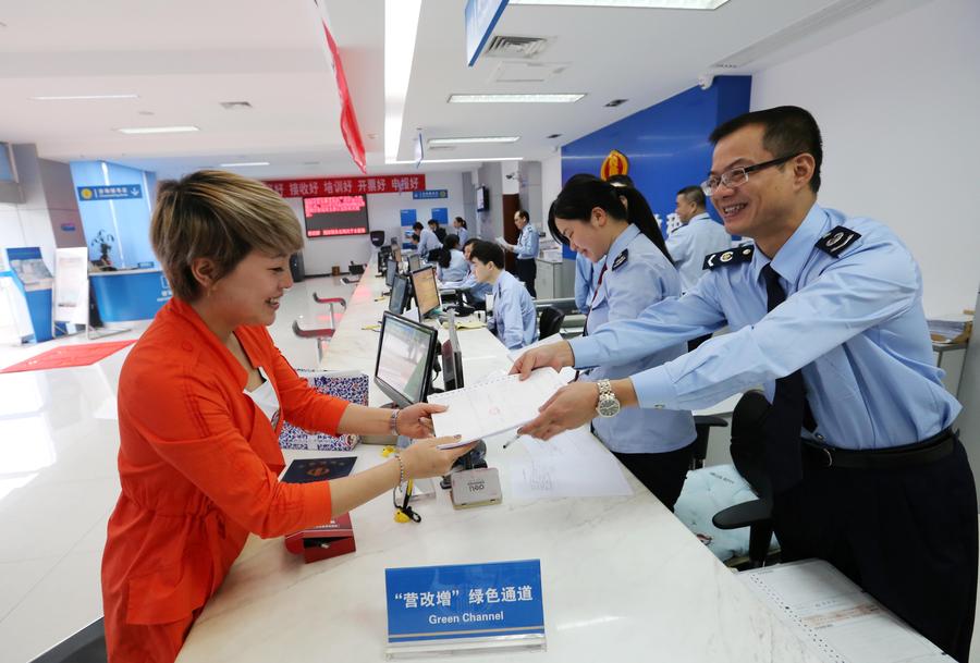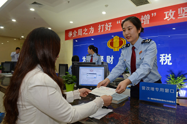 【廣西】5月1日,在廣西柳州市融安縣國(guó)稅局辦稅大廳,工作人員為納稅人辦理增值稅普通發(fā)票領(lǐng)用業(yè)務(wù)。當(dāng)日,營(yíng)業(yè)稅改征增值稅改革在全國(guó)推開。