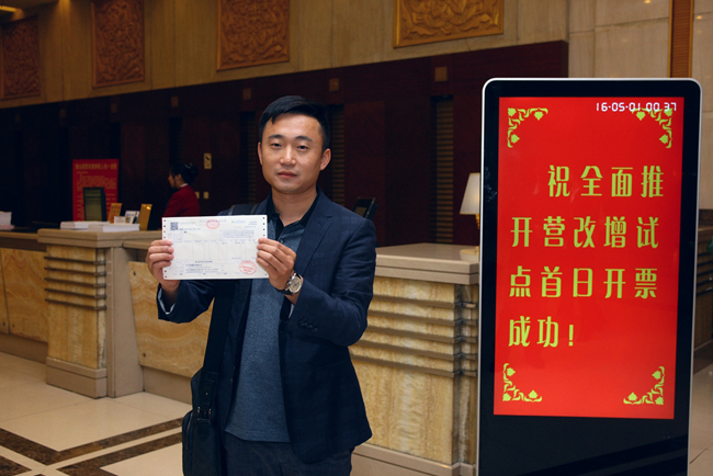 【寧夏】5月1日零點(diǎn)剛過,在寧夏自治區(qū)財(cái)政廳、國(guó)稅局、地稅局相關(guān)人員的見證下,銀川國(guó)貿(mào)中心假日酒店財(cái)務(wù)總監(jiān)楊明拿到了寧夏自治區(qū)營(yíng)改增試點(diǎn)開出的第一張?jiān)鲋刀惏l(fā)票。