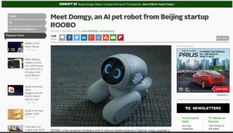 今年6月,這款名為“Domgy”的智能寵物機(jī)器人登上了全球最大的科技博客Techcrunch的封面頭版,制造了“Domgy”的創(chuàng)業(yè)公司ROOBO就坐落在北京,雖然剛剛成立了兩年,但這家公司目前已有300名員工,在全球有7個(gè)辦事處,其中一個(gè)位于美國(guó)西雅圖。