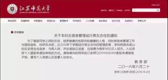 現(xiàn)代快報訊(記者 李偉豪)8月20日上午,一條截圖在微信朋友圈迅速傳開。截圖顯示是江蘇師范大學(xué)官網(wǎng)發(fā)布的一條通知,通知稱校方共2016年第二學(xué)期開始,可以申請男女合住。不過,很快,該校便通過官方微博辟謠,表示此為惡意造謠,保留追究造謠者發(fā)了責(zé)任的權(quán)利。