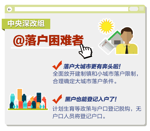 造福民眾讓深改組的故事深入人心。對重大改革尤其是涉及人民群眾切身利益的改革決策,深改組建立了社會評估機制。遇到關系復雜、牽涉面廣、矛盾突出的改革,深改組總能從人民的實際利益出發(fā)謀劃方案、制定舉措、推進落實。群眾生活情況怎么樣?群眾訴求是什么?改革能給群眾帶來哪些獲得感?總是深改組最關心的問題。1000天來,深改組先后對改革行政審批制度、改革工商注冊制度、推進社會主義核心價值體系建設、實施單獨兩孩政策、廢止勞動教養(yǎng)制度、改革和完善干部考核評價制度、改進干部選拔任用機制、堅持厲行節(jié)約反對浪費、深入開展黨風廉政建設和反腐敗斗爭等全社會高度關注、各方面抱有急切期盼的一系列問題,及時組織有關部門進行研究,出臺了系列政策措施和制度文件,有的還做出了法律決定。這些改革措施涉及到百姓生活的方方面面,對我國經(jīng)濟發(fā)展和民生改善產(chǎn)生了巨大的推動作用和深遠的社會影響。深改組在涉及農(nóng)民利益和城鄉(xiāng)關系等問題上動真刀、亮真槍。推進人的城鎮(zhèn)化的重要環(huán)節(jié)在戶籍制度,加快戶籍制度改革,是涉及億萬農(nóng)業(yè)人口轉(zhuǎn)移的重大舉措。深改組推出了尊重城鄉(xiāng)居民自主自愿、合理引導農(nóng)業(yè)人口轉(zhuǎn)移落戶城鎮(zhèn)的戶籍制度改革方案。為了促進大中小城市和小城鎮(zhèn)合理布局、功能互補,搞好基本公共服務,維護好農(nóng)民的土地承包經(jīng)營權、宅基地使用權、集體收益分配權,深改組陸續(xù)推出了《關于引導農(nóng)村土地承包經(jīng)營權有序流轉(zhuǎn)發(fā)展農(nóng)業(yè)適度規(guī)模經(jīng)營的意見》和《積極發(fā)展農(nóng)民股份合作賦予集體資產(chǎn)股份權能改革試點方案》等舉措,為農(nóng)民在城鎮(zhèn)化進程獲得更大的土地轉(zhuǎn)讓收益掃清了障礙。