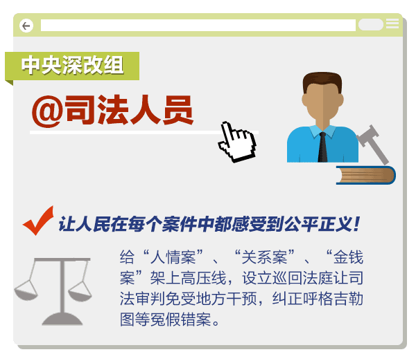 【言出必行】27次中央深改組會議,有18次涉及司法議題。其中的每一項舉措,都著眼于讓百姓感受到公平正義:建立領導干部干預司法案件記錄通報和責任追究制度,給“人情案”、“關系案”、“金錢案”架上了高壓線;在深圳、沈陽設立巡回法庭,使司法審判免受地方干預;出臺深化律師制度改革意見,律師執(zhí)業(yè)權利進一步保障。禁止干預司法案件正成為全社會共識,呼格吉勒圖、念斌、陳滿等冤假錯案得到糾正。
