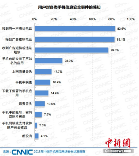 中新網(wǎng)北京10月10日電(吳濤)10日,中國互聯(lián)網(wǎng)絡(luò)信息中心發(fā)布的《2015年中國手機(jī)網(wǎng)民網(wǎng)絡(luò)安全狀況報告》顯示,截至2015年12月,95.9%的手機(jī)網(wǎng)民在2015年遇到過手機(jī)信息安全事件,其中,52.7%的用戶認(rèn)為自己沒有因此造成損失,26.4%的用戶在遭遇手機(jī)信息安全事件后不會采取任何措施進(jìn)行處理。