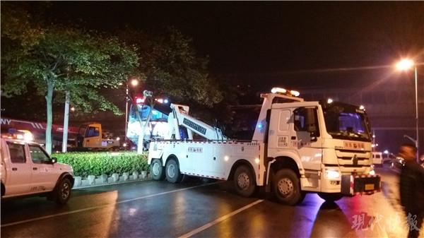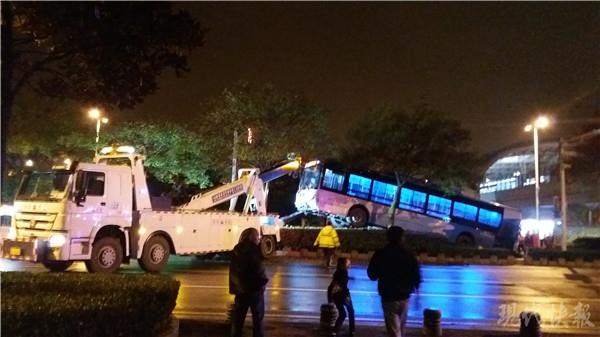 晚上7點(diǎn)50左右,現(xiàn)代快報(bào)記者在現(xiàn)場看到,事故發(fā)生在地鐵二號線羊山地鐵站附近的仙境路上,出租車已被救援走,一輛吊車正在把公交車從綠化帶上吊出。事發(fā)時(shí),公交車正從學(xué)原路·中醫(yī)藥大學(xué)站開往中醫(yī)藥大學(xué)站。兩車應(yīng)該是剛過仙林大道十字路口就發(fā)生了撞擊,事故留下的碎玻璃,從在仙境路上由南向北遺落了四五十米。