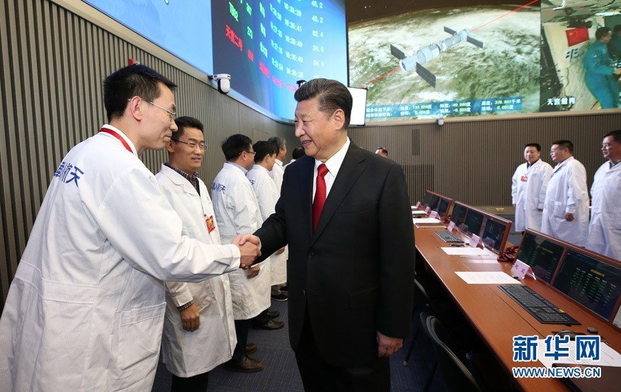 2013年6月24日,中共中央總書記、國(guó)家主席、中央軍委主席習(xí)近平來(lái)到北京航天飛行控制中心,同正在天宮一號(hào)內(nèi)執(zhí)行任務(wù)的神舟十號(hào)航天員聶海勝、張曉光、王亞平通話。