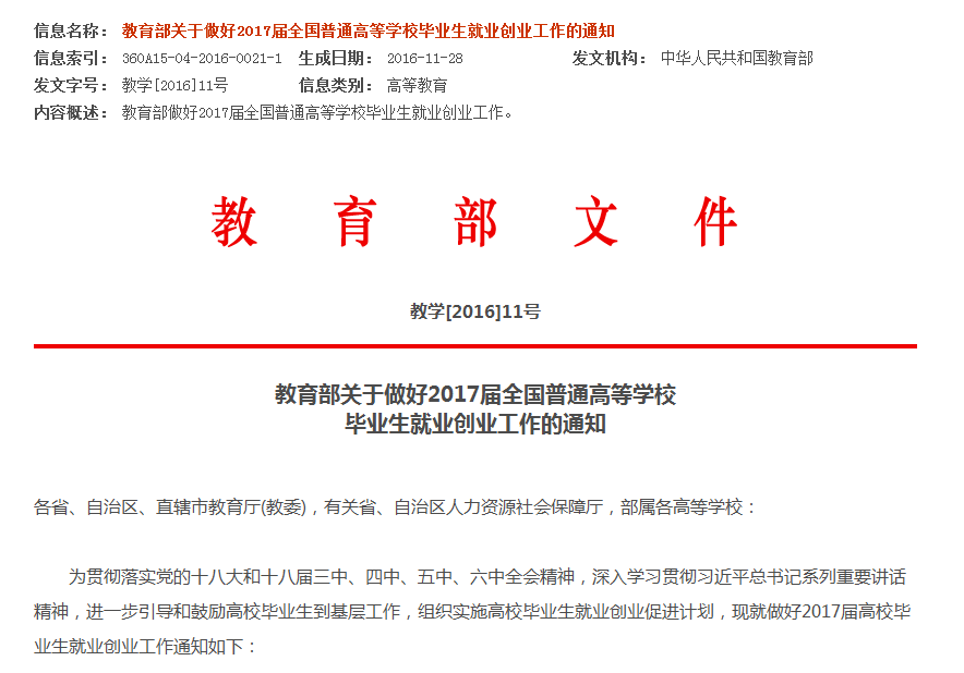 《教育部關(guān)于做好2017屆全國普通高等學(xué)校畢業(yè)生就業(yè)創(chuàng)業(yè)工作的通知》就此提出如下要求: