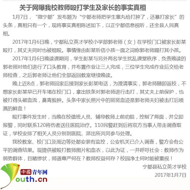 1月7日下午,中國(guó)青年網(wǎng)記者收到學(xué)校教師發(fā)來(lái)的情況說(shuō)明《關(guān)于網(wǎng)曝我校教師毆打?qū)W生及家長(zhǎng)的事實(shí)真相》。該說(shuō)明同時(shí)在學(xué)校網(wǎng)站發(fā)布。其稱,1月6日晚讀課期間,學(xué)生彭某與另外兩名學(xué)生擾亂課堂秩序,負(fù)責(zé)晚讀的老師對(duì)其進(jìn)行口頭教育后布置作業(yè)讓三人完成。在三人完成作業(yè)后,老師讓三名學(xué)生返回教室繼續(xù)晚讀。