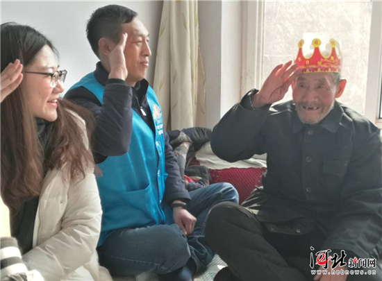 1月24日,秦皇島市志愿服務(wù)隊來到抗戰(zhàn)老兵徐山家中進行慰問,并為老人慶祝生日。圖為徐山老人高興的向大家敬起了軍禮。記者宋柏松攝