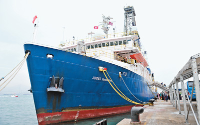圖為“決心”號(hào)大洋鉆探船停泊在香港招商局碼頭。