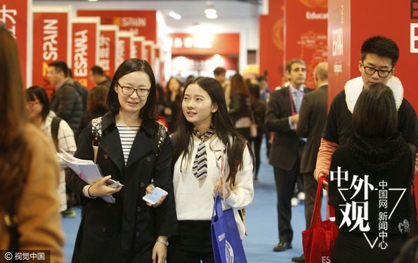 2016年10月22日,北京中國(guó)國(guó)際教育展上,學(xué)生和家長(zhǎng)在參觀出國(guó)留學(xué)展臺(tái)。視覺中國(guó)