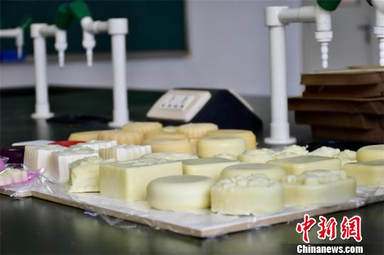 當天中午12時許,筆者在該校生物與制藥工程學院實驗室看到,環(huán)保手工皂色彩繽紛,造型以卡通動物、人物為主,包括海綿寶寶、米奇鼠等,每塊均頗為精致。一旁的操作臺上,擺放著不同種類的植物油、量杯和模具。