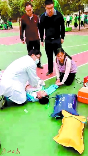 到了現(xiàn)場,歐杏妹趕緊蹲下,發(fā)現(xiàn)學(xué)生胸口已沒有起伏,一摸頸部主動脈,也沒有搏動了。意識到情況的嚴重性,她用聽筒器一聽,心臟也完全沒有了跳動。“當時正是大課間,籃球場上都是跑操的學(xué)生。學(xué)生突發(fā)暈倒之后,學(xué)校馬上啟動應(yīng)急預(yù)案,現(xiàn)場老師通力合作,撥打120急救電話,并把學(xué)生帶回課室。”該校相關(guān)負責(zé)人屈老師告訴記者,這樣做一是為了減少對學(xué)生心理的沖擊,二是避免學(xué)生圍觀,干擾急救。