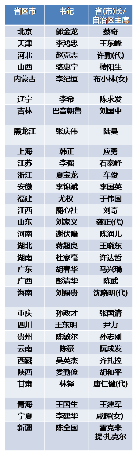 全國(guó)31省區(qū)市現(xiàn)任黨政“一把手”名單