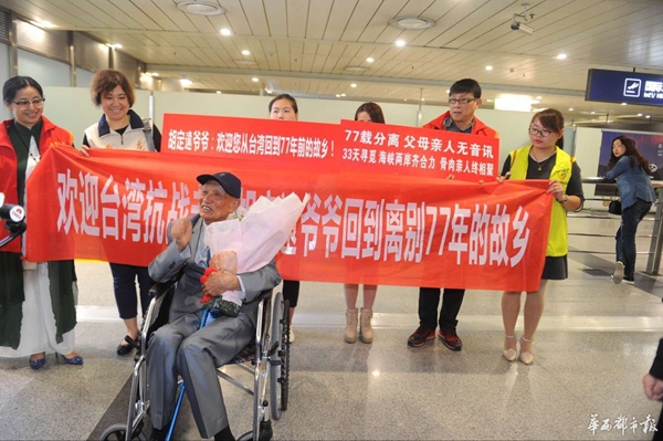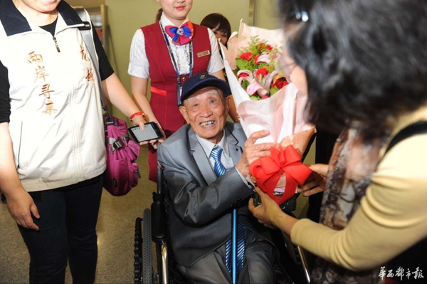 4月19日晚9點(diǎn),成都雙流國際機(jī)場,一架從寶島臺灣飛來的飛機(jī),穩(wěn)穩(wěn)降落在四川的土地上,胡定遠(yuǎn)蹣跚著從機(jī)艙走出,眼前的景象令這位老人眼眶濕潤,“我回家了!
