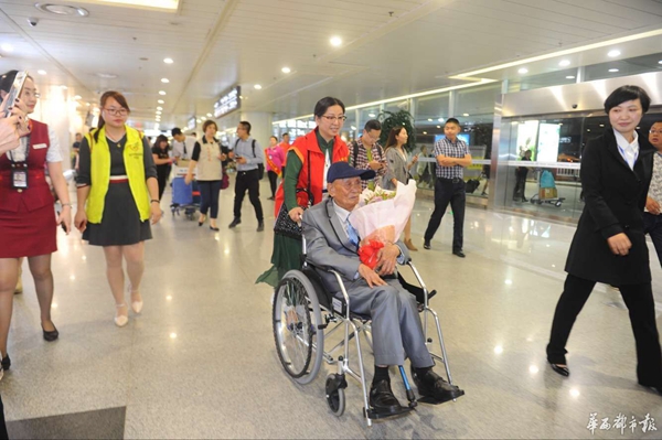 當(dāng)晚9點(diǎn)45分左右,胡定遠(yuǎn)坐在機(jī)場提供的輪椅上,出現(xiàn)在了眾人的視野里。面對前來迎接的志愿者,胡老微笑著,點(diǎn)頭、揮手以示回應(yīng),還用地道的瀘州話不斷說著“謝謝”。同時(shí),他的目光始終在打量周圍的景象,70余年時(shí)光飛逝,這里的景象早非當(dāng)年!肮烙(jì)老家沒人認(rèn)識我了!焙陷p嘆。