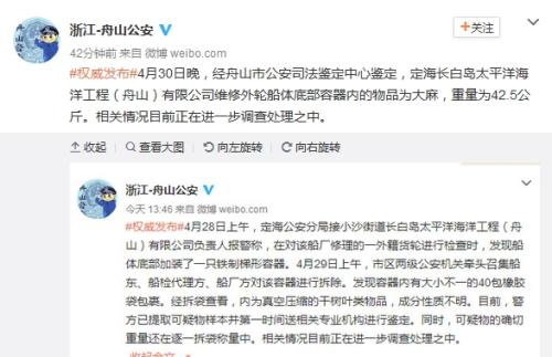 今日下午浙江舟山市公安局官方微博發(fā)布消息稱,4月30日晚,經(jīng)舟山市公安司法鑒定中心鑒定,定海長(zhǎng)白島太平洋海洋工程(舟山)有限公司維修外輪船體底部容器內(nèi)的物品為大麻,重量為42.5公斤。