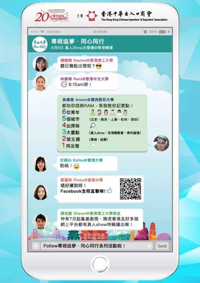 據(jù)悉,該活動為中出慶回歸廿周年系列活動的重點項目,籌備歷時半年,以真人騷形式進行,特別安排專業(yè)攝製團隊跟拍活動全程,邀請了6位不同背景的香港青年圍繞“尋根”、“追夢”的主題,游歷北京、南京、上海、杭州及深圳五個城市,廣泛接觸在內(nèi)地工作、創(chuàng)業(yè)、學(xué)習(xí)的香港青年,用香港青年的眼光看中華民族的歷史與民間風(fēng)俗,了解內(nèi)地的經(jīng)濟發(fā)展和今昔變遷。