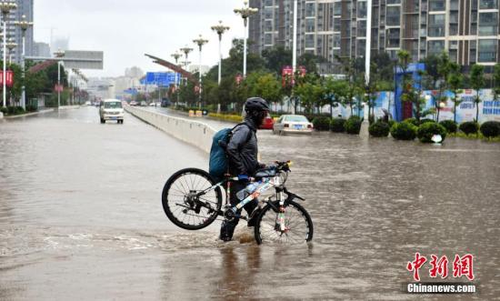 7月22日,民眾抬著自行車從積水路上走過(guò)。當(dāng)日,昆明持續(xù)降雨,城區(qū)多處路段積水。昆明市氣象臺(tái)發(fā)布暴雨藍(lán)色預(yù)警,未來(lái)12小時(shí)昆明市區(qū)及周邊多地區(qū)將持續(xù)降雨。 中新社記者 任東 攝