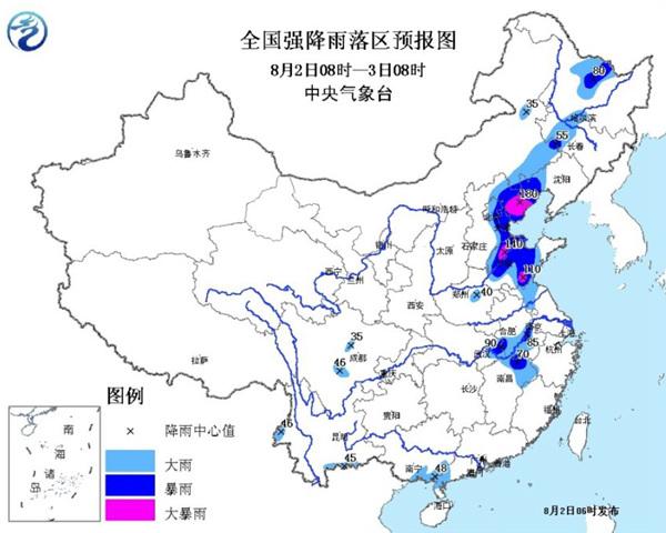 中央氣象臺預計,8月2日8時至3日8時,江西東北部、湖北東北部、安徽南部、江蘇北部、山東中西部、河北東部、北京東部、天津、遼寧西部、內蒙古東南部、吉林西部以及黑龍江中部、云南南部等地的部分地區(qū)有大雨或暴雨,局地有大暴雨(100~180毫米),最大小時雨強可達70毫米。為此,中央氣象臺繼續(xù)發(fā)布暴雨藍色預警。