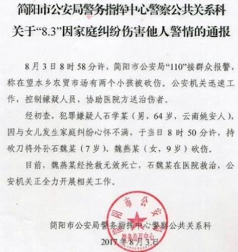 8月3日8時58分,四川省簡陽市公安局“110”接到群眾報警,稱在簡陽市望水鄉(xiāng)農(nóng)貿(mào)市場有兩個小孩被一個60多歲的老人用刀猛砍,一個被砍倒在地上,傷勢嚴重,另一個被砍傷。接警后,簡陽公安機關(guān)迅速展開工作,在控制嫌疑人的同時,協(xié)助醫(yī)院方送治傷者。