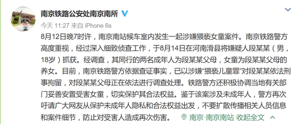 央廣網(wǎng)北京8月15日消息(記者王晶)近日,引發(fā)輿論持續(xù)關(guān)注的“南京南站猥褻女童案”,今天上午再次有了最新進展。據(jù)南京鐵路公安處南京南所官方微博稱,經(jīng)調(diào)查,其同行的兩名成年人為段某某父母,女童為段某某父母的養(yǎng)女。
