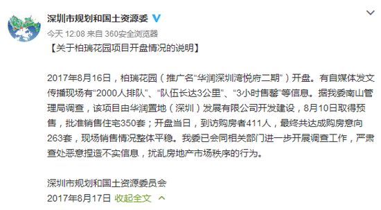 8月16日,柏瑞花園(推廣名“華潤(rùn)深圳灣悅府二期”)開盤。有自媒體發(fā)文傳播現(xiàn)場(chǎng)有“2000人排隊(duì)”、“隊(duì)伍長(zhǎng)達(dá)3公里”、“3小時(shí)售罄”等信息。據(jù)深圳市規(guī)劃和國(guó)土資源委員會(huì)南山管理局調(diào)查,該項(xiàng)目由華潤(rùn)置地(深圳)發(fā)展有限公司開發(fā)建設(shè),8月10日取得預(yù)售,批準(zhǔn)銷售住宅350套;開盤當(dāng)日,到訪購(gòu)房者411人,最終共達(dá)成購(gòu)房意向263套,現(xiàn)場(chǎng)銷售情況整體平穩(wěn)。深圳市規(guī)劃和國(guó)土資源委員會(huì)已會(huì)同相關(guān)部門進(jìn)一步開展調(diào)查工作,嚴(yán)肅查處惡意捏造不實(shí)信息,擾亂房地產(chǎn)市場(chǎng)秩序的行為。