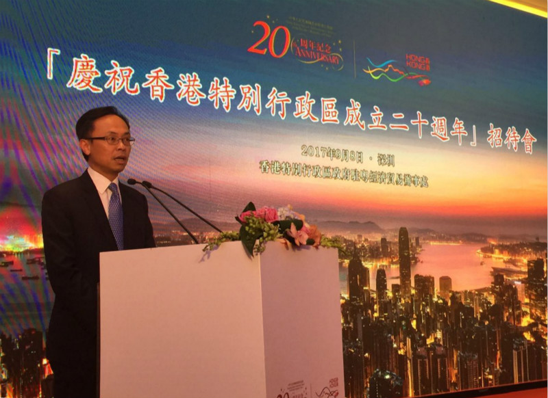 央廣網(wǎng)深圳9月9日消息(記者黃倩)昨晚(8日),由香港特區(qū)政府駐粵經(jīng)濟(jì)貿(mào)易辦事處主辦的“慶祝香港特別行政區(qū)成立二十周年”招待會(huì)在深圳舉行。香港特區(qū)政府政制及內(nèi)地事務(wù)局局長(zhǎng)聶德權(quán)出席并致辭表示,深港合作將踏上新臺(tái)階。