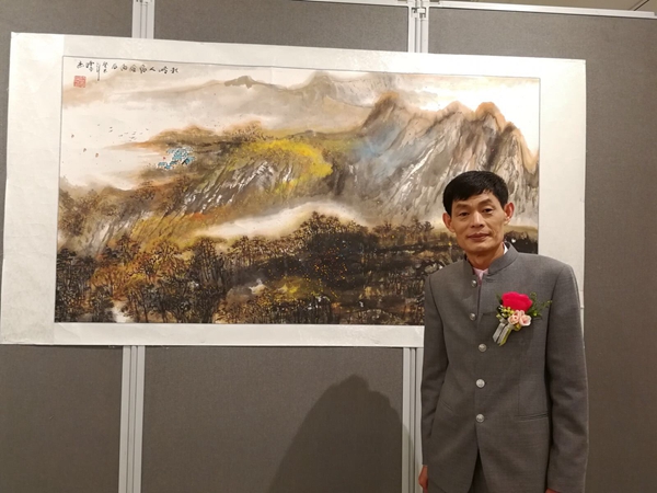 步入展廳,氣勢磅礴的多幅山水作品映入眼簾,如連綿不斷的山脈,猶如置身于大山大嶺之中。尤其擅長于山水畫創(chuàng)作的盛懷杰接受大公報(bào)記者采訪時說,本身是美術(shù)老師,后來因緣際會開始專研創(chuàng)作山水,偶也寫花鳥等主題,但認(rèn)為山水最能表達(dá)人的情懷,以及對于祖國山河的熱愛、謳歌。山水畫還可表現(xiàn)各地不同地區(qū)不同季節(jié)的特色。