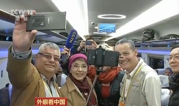 這位在復(fù)興號高鐵旁進(jìn)行出鏡拍攝的女記者,來自美國中文電視臺。第一次來北京,她就迫不及待地要體驗(yàn)中國高鐵。進(jìn)入車廂后,這些外國記者們可不像中國乘客一樣老實(shí)坐著,而是扛著“長槍短炮”到處尋找這個中國“新發(fā)明”到底有何高明之處。
