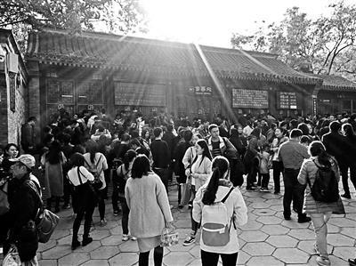 游客到了香山公園景區(qū)大門外,需要先行購票才能入園,香山公園單張門票的價格是10塊錢。上午9時許,北青報記者在公園北門看到,這里的8個售票窗口全部開放,但是因為人數(shù)較多,每個窗口外排隊買票的人還是排了二三十米的長度。