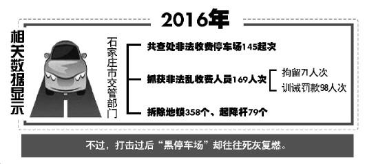 對于群眾深惡痛絕的黑停車場,石家莊市交警部門一直沒有停止打擊。相關(guān)數(shù)據(jù)顯示,2016年,石家莊市交管部門共查處非法收費停車場145起次;抓獲非法亂收費人員169人次,其中拘留71人次、訓(xùn)誡罰款98人次;拆除地鎖358個、起降桿79個。不過,打擊過后黑停車場卻往往死灰復(fù)燃。