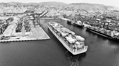 中遠海運的貨船駛出中國和希臘合力打造的比雷埃夫斯港集裝箱碼頭。新華社發(fā)