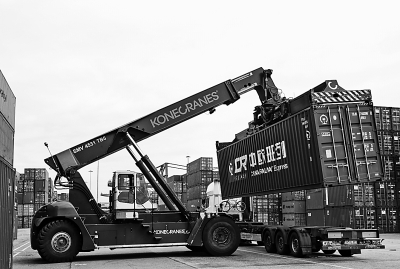 在德國西部城市杜伊斯堡的DIT貨運場站,起重車搬運中歐班列集裝箱。新華社發(fā)