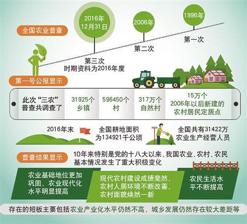 自2015年6月份起,國務(wù)院決定開展第三次全國農(nóng)業(yè)普查。此次普查的標(biāo)準(zhǔn)時點為2016年12月31日,時期資料為2016年度,共調(diào)查了31925個鄉(xiāng)鎮(zhèn),其中鄉(xiāng)11081個,鎮(zhèn)20844個;596450個村,其中556264個村委會,40186個涉農(nóng)居委會;317萬個自然村;15萬個2006年以后新建的農(nóng)村居民定居點。