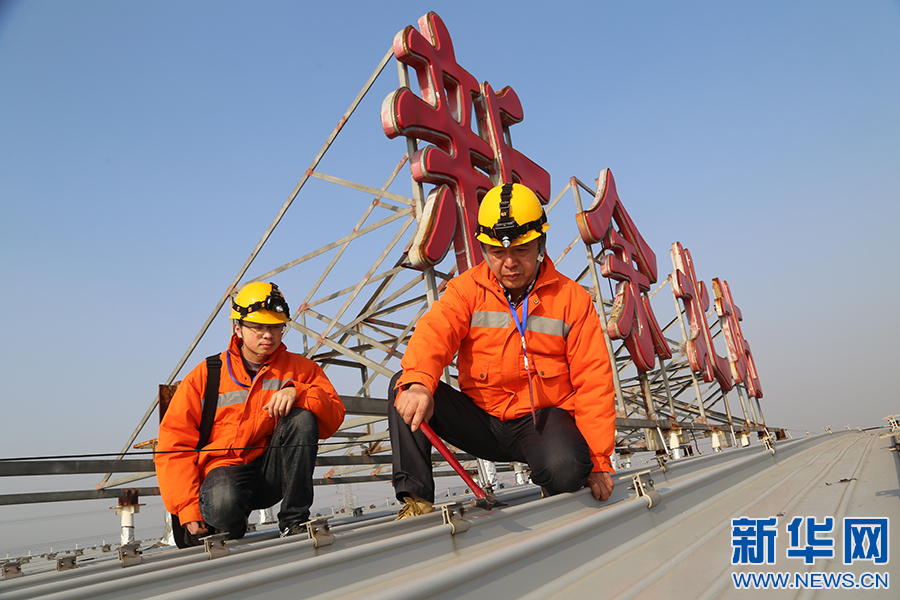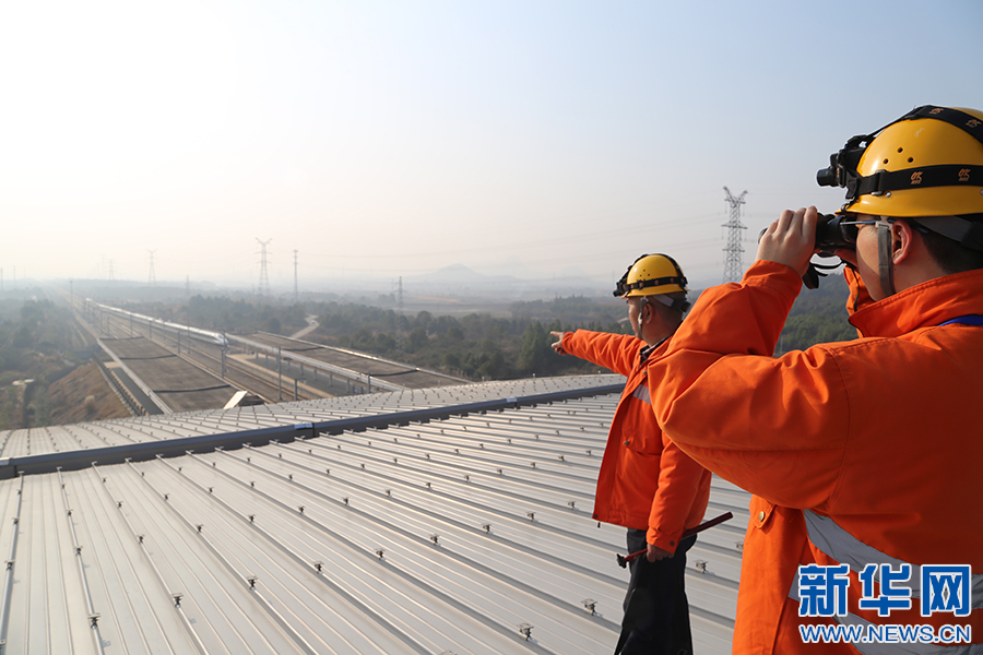 徐小云和李浩翔站在屋面,用望遠(yuǎn)鏡對站臺雨棚頂部進(jìn)行檢查。