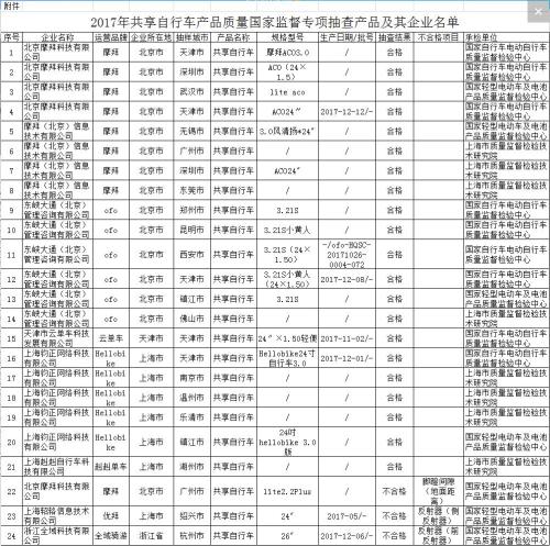 2017年共享自行車產(chǎn)品質(zhì)量國(guó)家監(jiān)督專項(xiàng)抽查產(chǎn)品及其企業(yè)名單