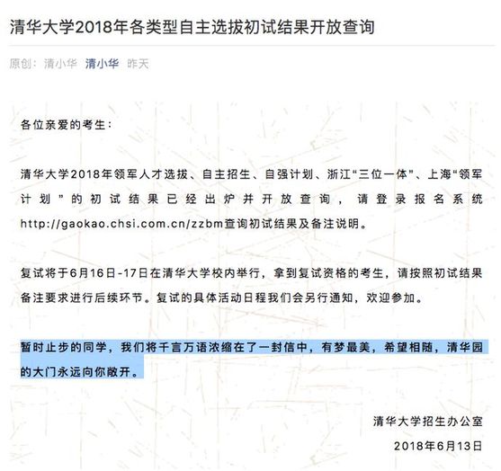 對(duì)于“暫時(shí)止步的同學(xué)”,清華招辦發(fā)出一封信,暖心約定“清華園的大門永遠(yuǎn)向你敞開”!