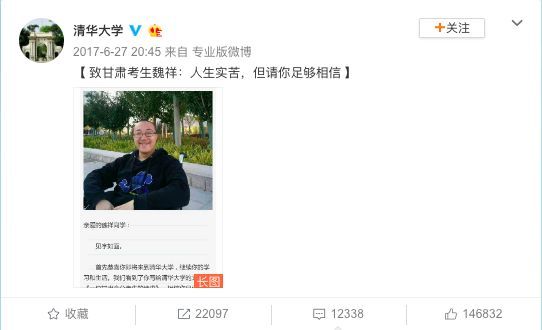 首先恭喜你即將來(lái)到清華大學(xué),繼續(xù)你的學(xué)習(xí)和生活。我們看到了你寫給清華大學(xué)的文章《一位甘肅高分考生的請(qǐng)求》,相信你早已具備了清華人自強(qiáng)不息、厚德載物的品質(zhì),我們代表清華園歡迎來(lái)自甘肅定西的你!