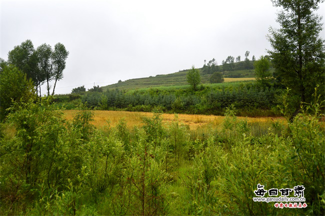 綠樹(shù)掩映中,馬巴村的麥田里涌動(dòng)著金色的麥浪。(每日甘肅網(wǎng)記者韋德占/攝)