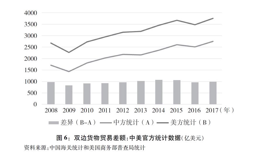 此外,美國(guó)統(tǒng)計(jì)方法相對(duì)高估了中美貨物貿(mào)易逆差額。中美雙方的統(tǒng)計(jì)差異長(zhǎng)期存在,且差異較大。2017年,中國(guó)統(tǒng)計(jì)對(duì)美貨物貿(mào)易順差為2758億美元,美國(guó)統(tǒng)計(jì)對(duì)華逆差接近3958億美元,相差1000億美元左右。由中美兩國(guó)商務(wù)部相關(guān)專家組成的統(tǒng)計(jì)工作組,每年就中美貿(mào)易統(tǒng)計(jì)差異進(jìn)行一次比較研究。根據(jù)該工作組測(cè)算,美國(guó)官方統(tǒng)計(jì)的對(duì)華貿(mào)易逆差每年都被高估20%左右。根據(jù)中國(guó)海關(guān)和美國(guó)商務(wù)部普查局的統(tǒng)計(jì),雙方統(tǒng)計(jì)結(jié)果在最近十年來(lái)的走勢(shì)和變動(dòng)幅度大致相同(圖6)。引起差異的原因包括進(jìn)口價(jià)格和出口價(jià)格之間的差異、轉(zhuǎn)口貿(mào)易增值、直接貿(mào)易加價(jià)、地理轄區(qū)、運(yùn)輸時(shí)滯等。