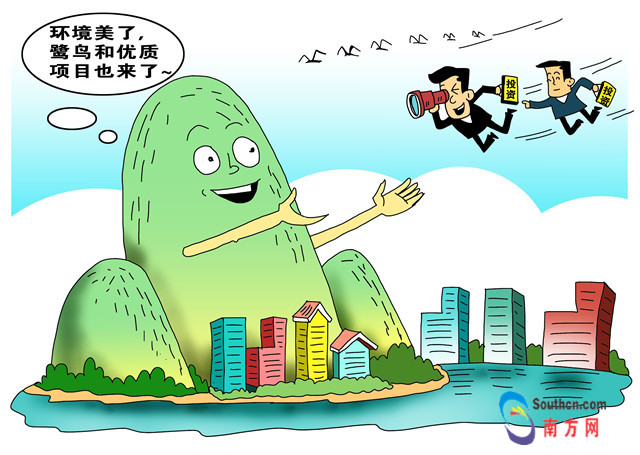 落實(shí)綠色發(fā)展理念,村民一邊享受著天藍(lán)、地綠、水凈的優(yōu)質(zhì)環(huán)境,另一邊也分享著經(jīng)濟(jì)快速發(fā)展帶來的“金山銀山”。(漫畫作者:朱慧卿)